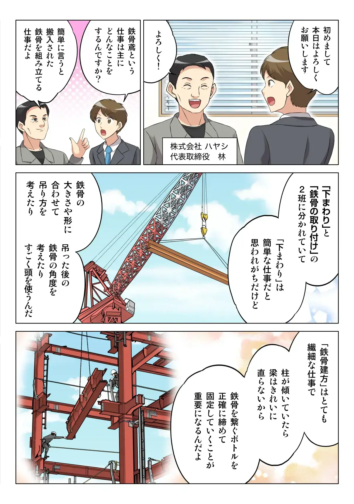 建物の骨組み部分を担当するのがハヤシです。作業ではクレーンを使用する場面もあり、周りに気を配りながら作業を進める必要があります。優れた技術力が必然的に身について成長を感じられます。